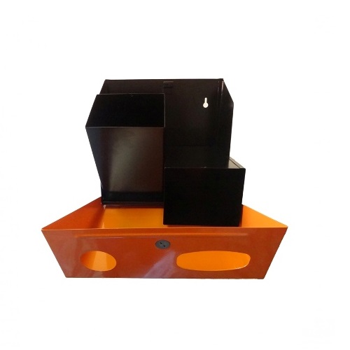 Suporte de parede para descarte de pilhas e baterias em aço carbono 1020 com pintura eletrostática nas cores preta e laranja.