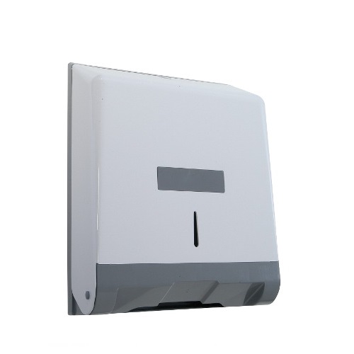 Toalheiro para papel interfolha 2 ou 3 dobras injetado com a frente em plástico ABS branco, com visor frontal para controle de substituição do papel interfolha e fundo em Plástico ABS cinza.